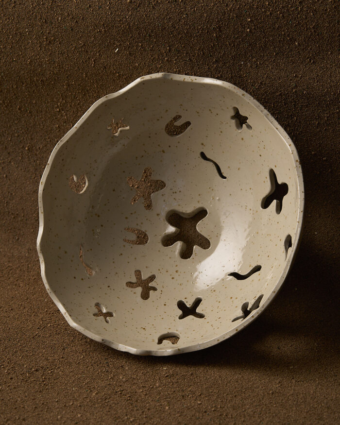 Fruteiro en gres moteado claro con recortes de formas organicas.