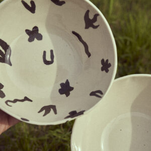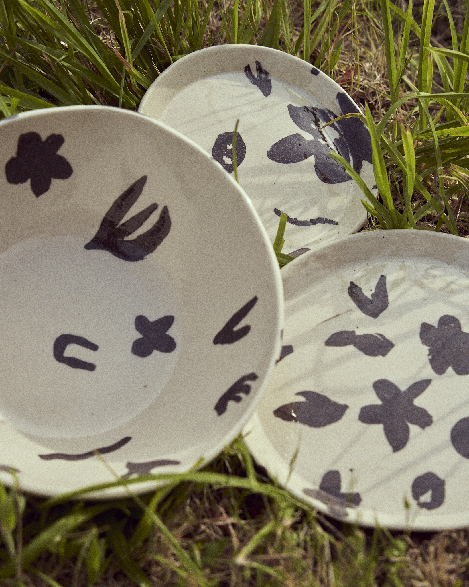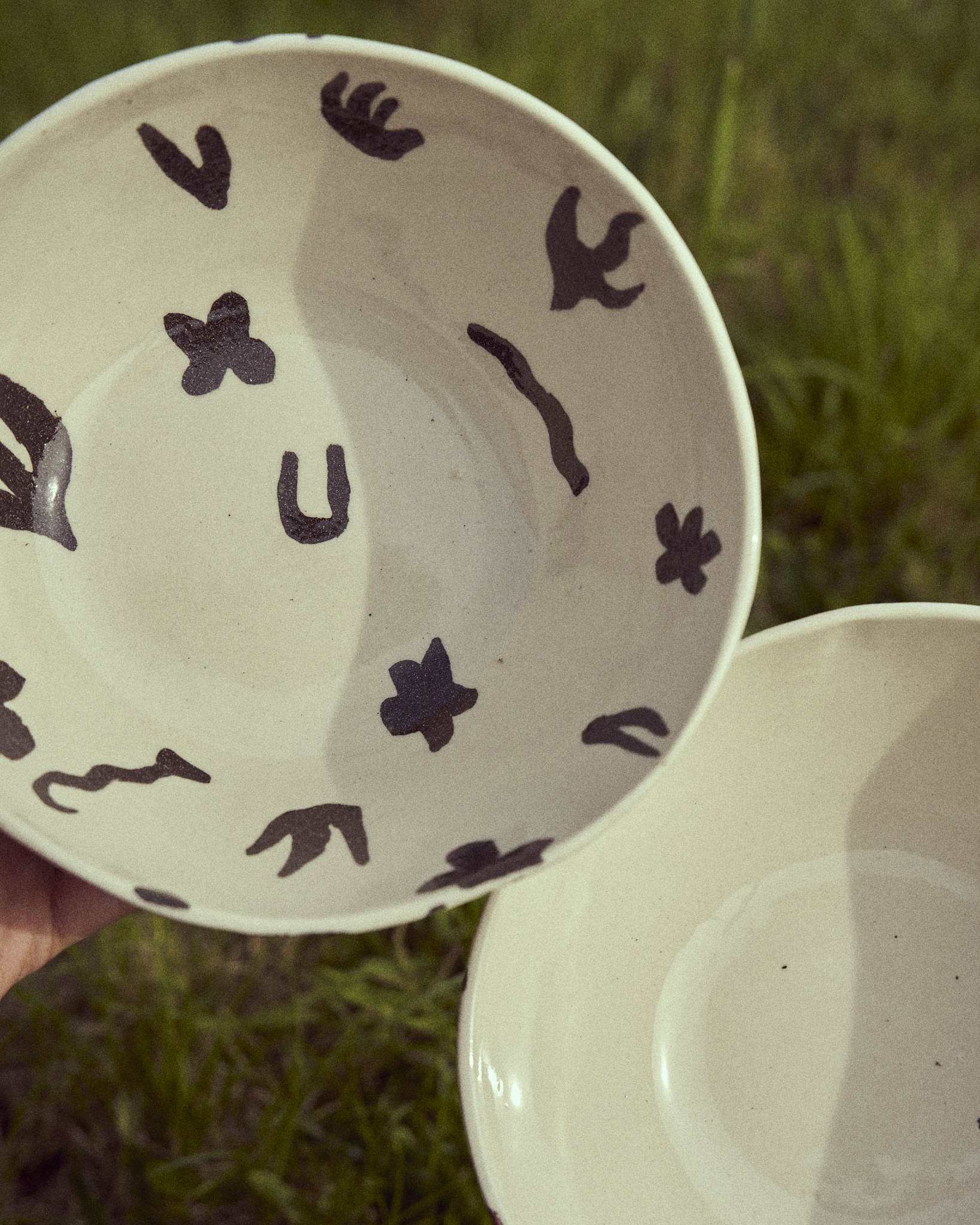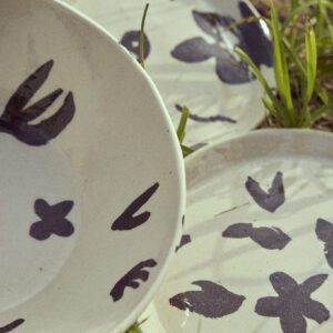 Platos de cerámica esmaltada con trazos únicos y gestuales. Cada uno es una composición irrepetible entre forma, gesto y fuego.