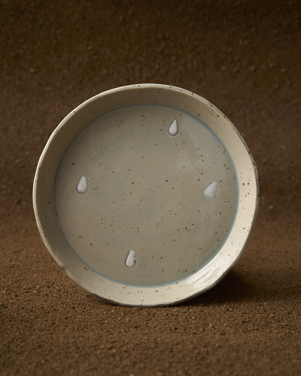 Prato en gres claro moteado con debuxos de gotas debuxados con engobe, da colección Pingas