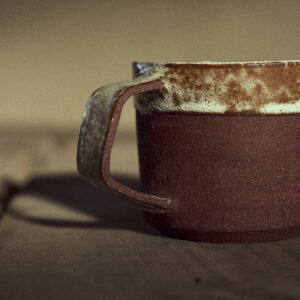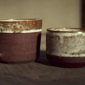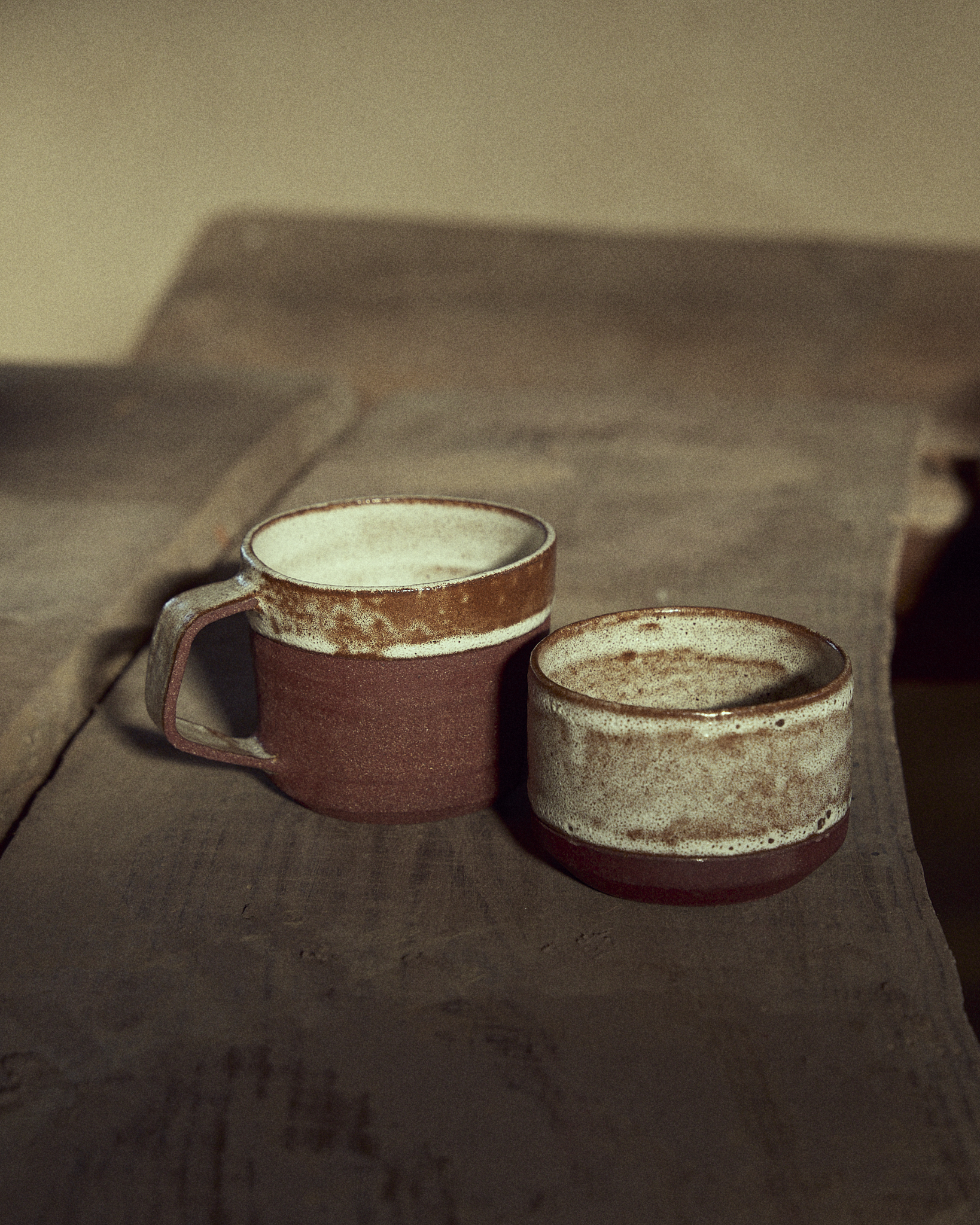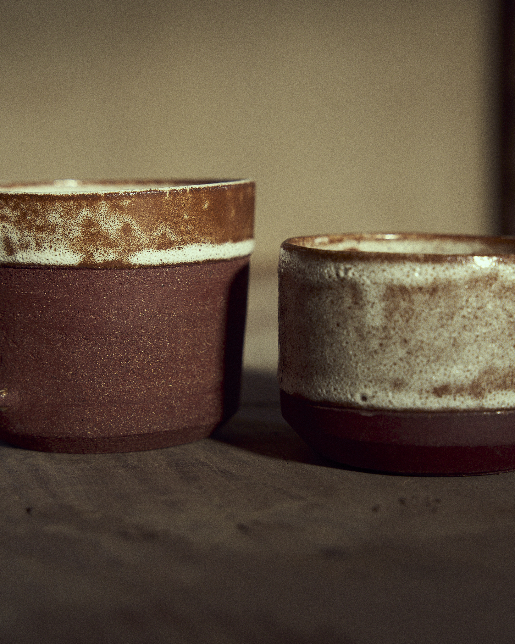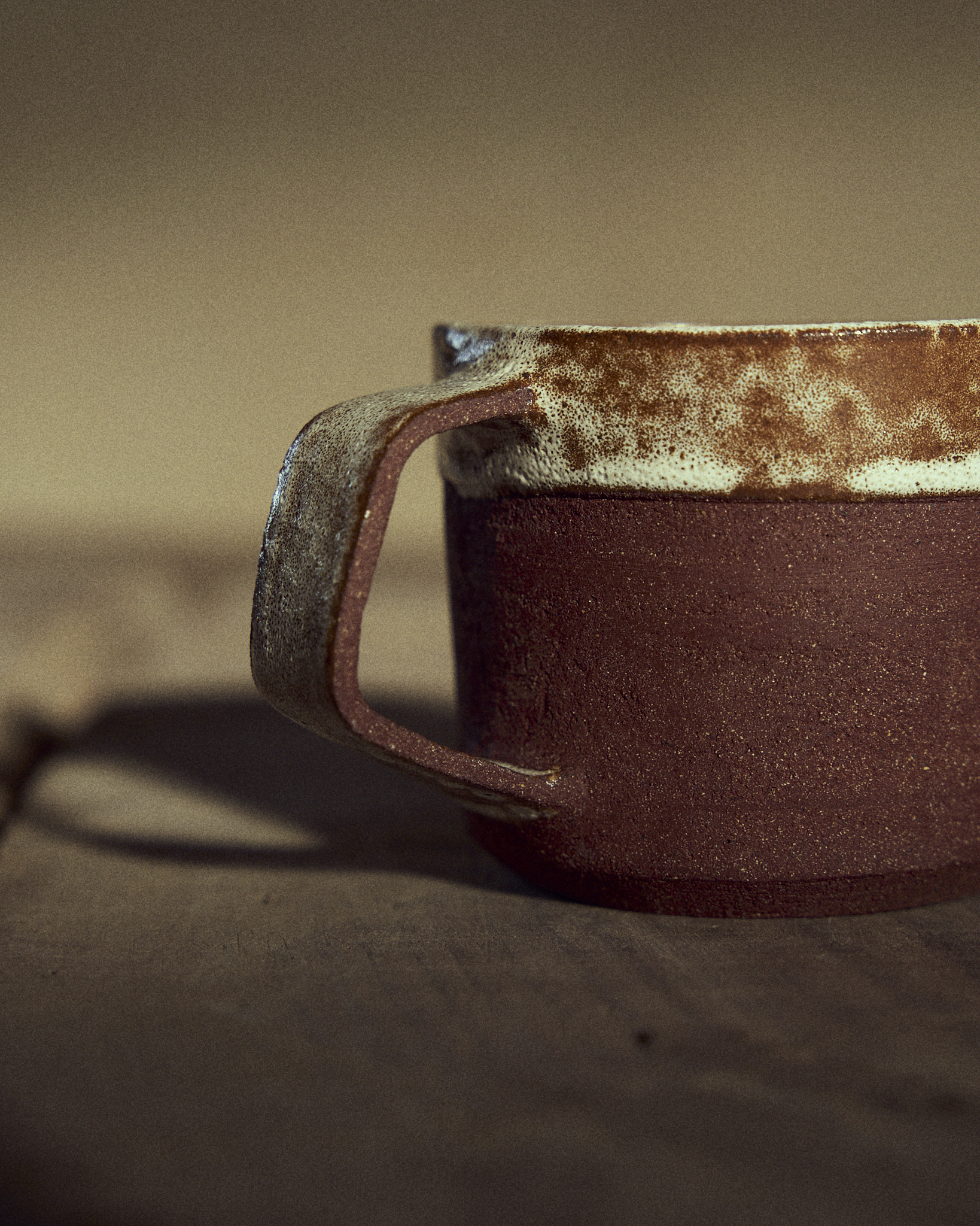 Cada taza se crea en el torno, combinando barro rojo gallego con un esmalte oscuro de acabado irregular. El contraste entre ambos materiales revela la dualidad del proceso: lo crudo y lo pulido, lo natural y lo contenido.